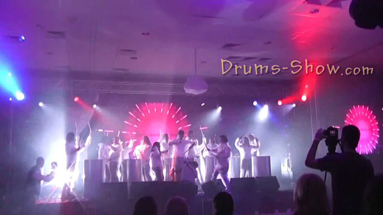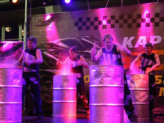 Шоу барабанщиков на металлических бочках с водой и цветной подсветкой (световые приборы на сцене площадки)